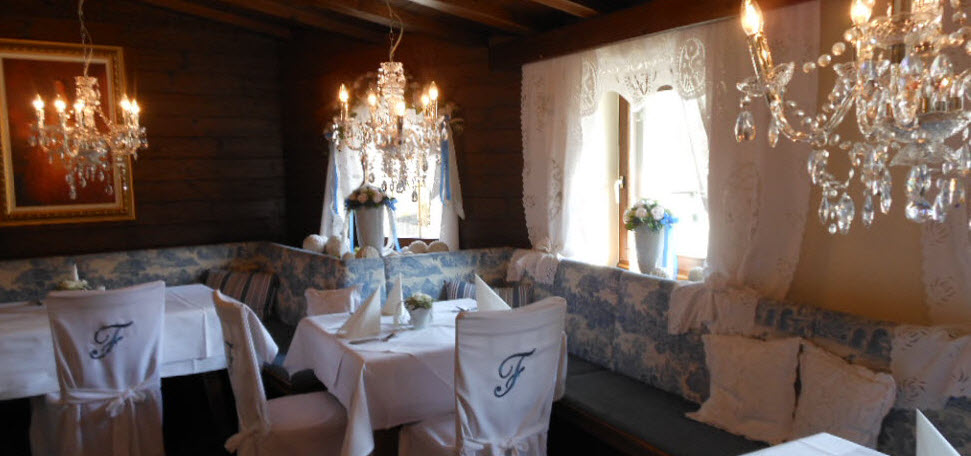 Ausstattung einzelner Stuben mit exklusiven Richelieuvorhängen, Vorhängen mit Stickereien und Vorhängen mit Kristallen aus handgewebten Naturleinen.